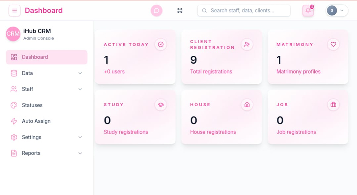 iHub CRM is a modern, security-first Customer Relationship Management platform designed to manage staff operations, client registrations, and multiple service workflows from a single, unified dashboard. Built with scalability and data protection in mind, it enables organizations to efficiently handle high-volume client data while maintaining strict access control and audit compliance.